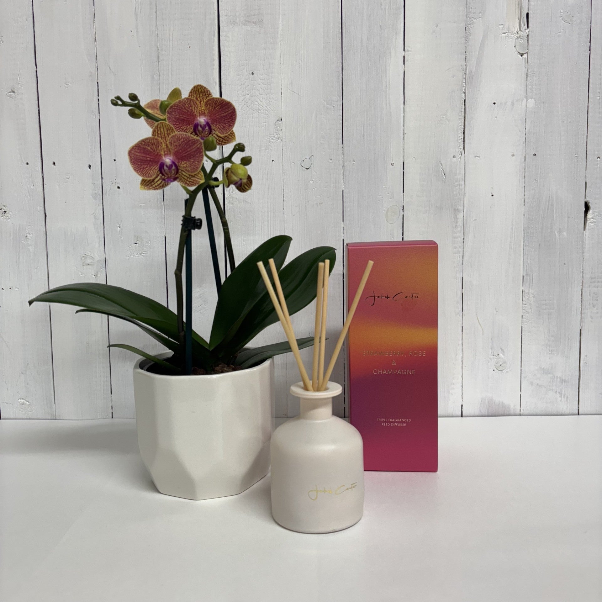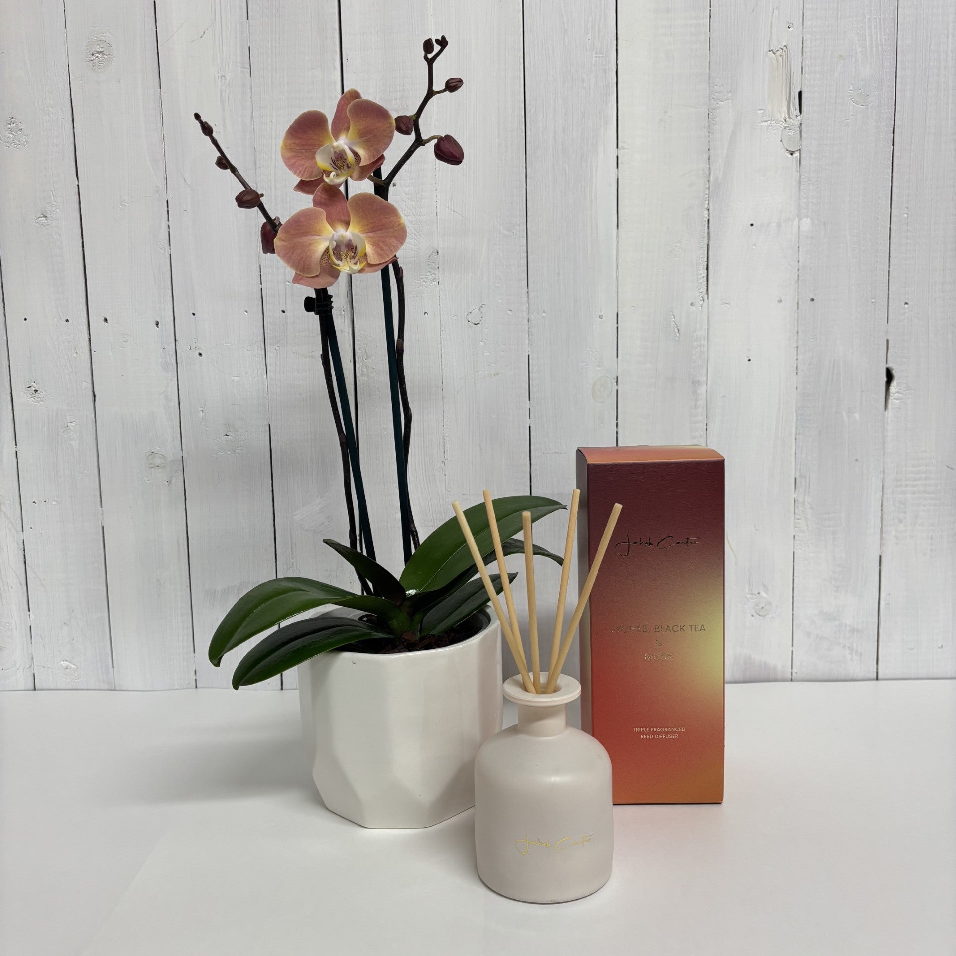 Lovely gift bundle featuring a gorgeous peach coloured Phalaenopsis Orchid paired with a luxury Jakob Carter diffuser - choose from 5 scents